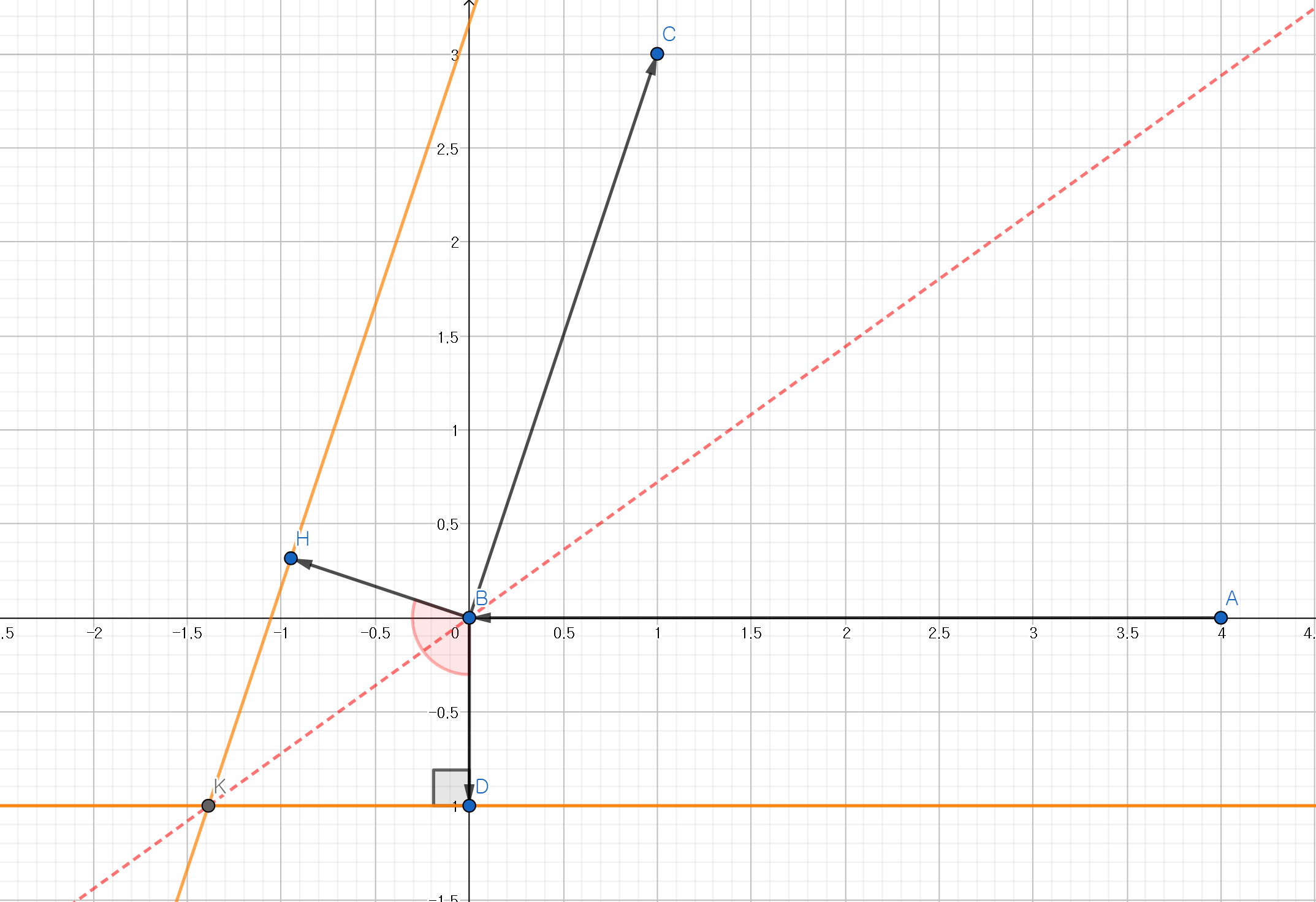 따라서 BD,BH 사이각을 θ라고 한다면, 각(DBK)는 θ/2가 된다.